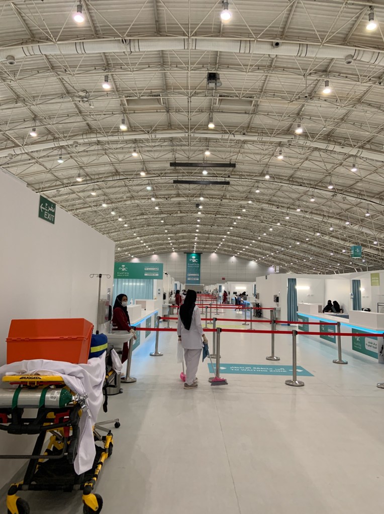 I was assigned to the Riyadh Expo Center location. My driver knew where it was, and as we approached, a series of very clear signs, in English and Arabic, showed where to enter. Friendly helpers waved us to the drop-off area. Masked staff were waiting at the bottom of the giant ramp leading to the center to show the way. They also had a fleet of wheelchairs waiting for those patients who might find it difficult to make the walk. As I reached the top of the ramp, there were several different lines to get in, all with markers to stand on to remain socially distanced. At the door I scanned the QVC code I had received on the app and was directed to a numbered waiting room. The entire enormous floor of the expo center was transformed into hundreds of mini doctors’ offices. The many waiting rooms each only held 4-6 people, with the chairs spaced far apart. The numbers for the waiting rooms were in Arabic and English script.