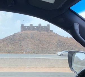 Our more than ten-hour trek was certainly not dull. We saw lots of camels, sheep, goats and donkeys, some of them riding in vehicles! Very surprisingly, we also spotted a group of baboons (who knew they lived in Saudi?) sitting in a semi-circle on top of a heap of a trash near a truck stop. A Pakistani trucker in traditional dress was attempting to creep up on them to take a photo with his phone. Sadly, I was not quick enough to get a photo myself, and they were not there on the return journey. Gas stations were plentiful, although ladies’ restrooms (clean or otherwise) were very few and far between. From the looks of things, very few females make this drive. It was a cool surprise to see some castle ruins atop a ridge.