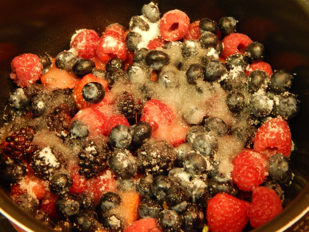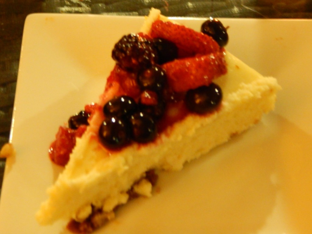 I was able to find all the other ingredients locally, including Philadelphia brand cream cheese. I have not, however, been able to find the block type, only the tub. I know from experience that the tub has a higher water content so I cut back on the sour cream by about 2 tablespoons. While the cheesecake was baking away in its water bath I made the berry sauce (a link in the Once Upon a Chef recipe. After what seemed a very long time, the cheesecake was finished. It came out beautifully smooth!