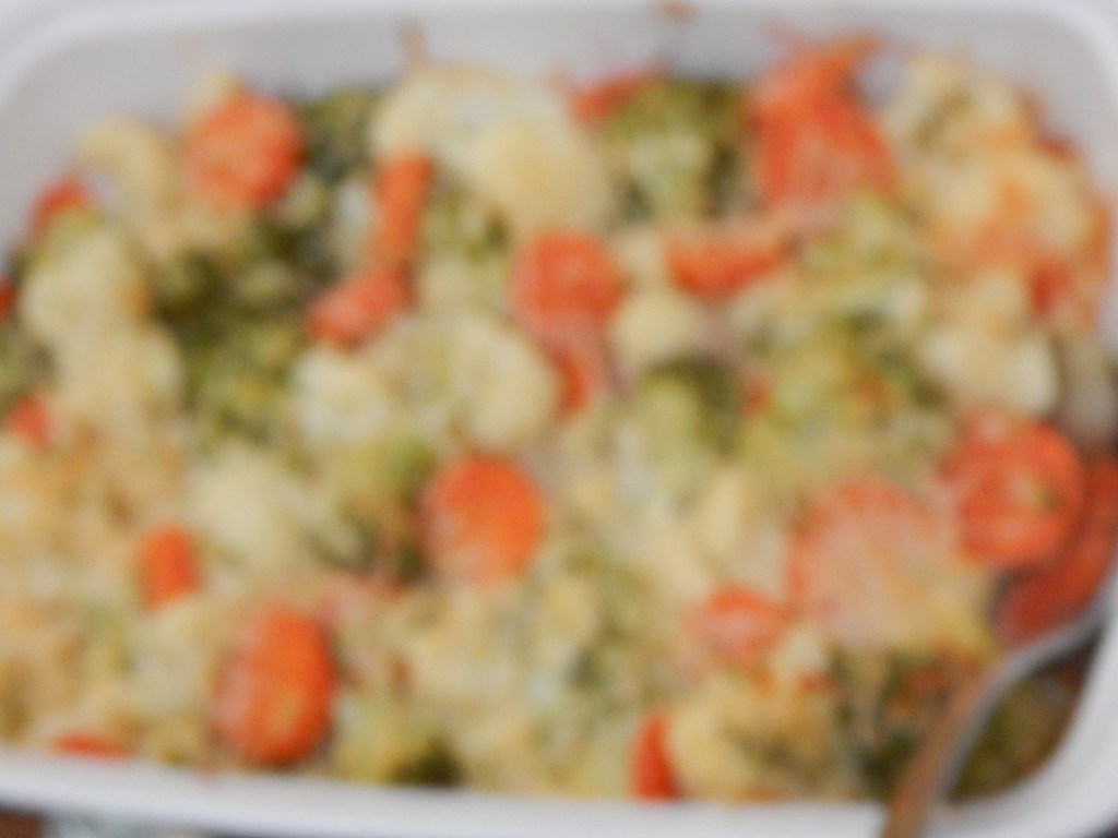On the day before the dinner, I also made the potatoes au gratin. I sliced 6 potatoes thin using my KitchenAid food processor. I made a standard cheese sauce: melted butter, adding flour, then milk and adding cheddar and monterey jack cheese until I got the desired consistency. I poured all into a 9 X 13 pan and refrigerated overnight. Just before baking I sprinkled it with bread crumbs mixed with a bit of melted butter.