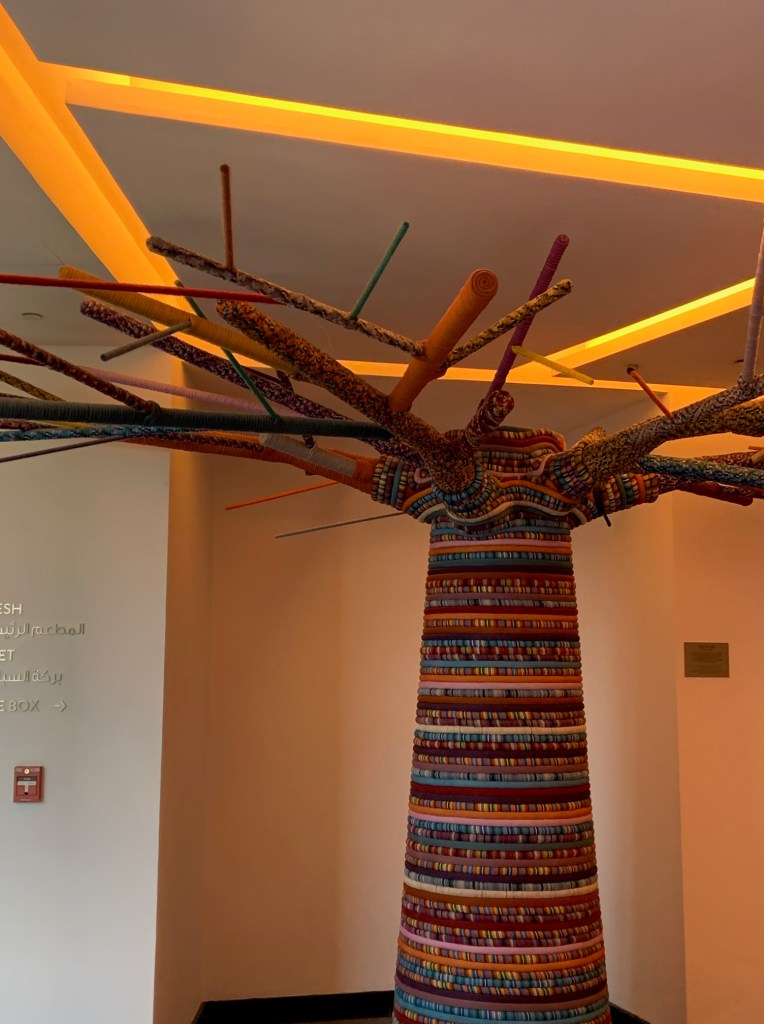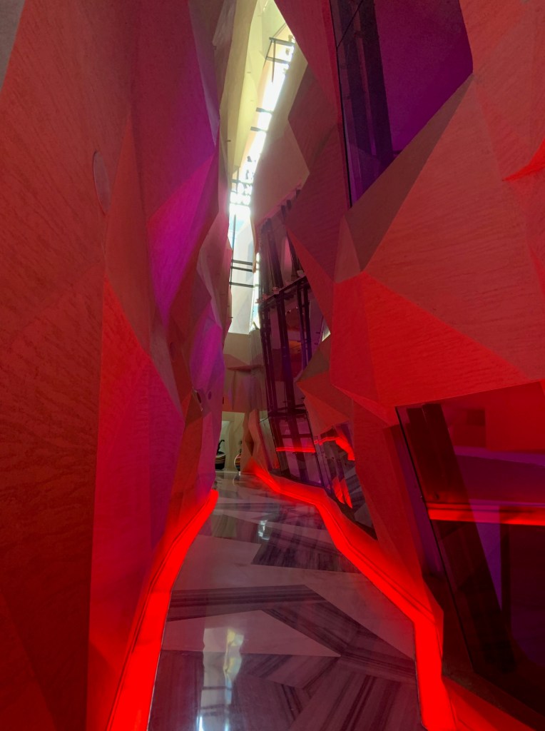 We stayed at the new and ultra-modern W Hotel. The designers were, clearly, trying very hard to be artsy and cutting-edge, while also acknowledging Jordan’s rich historical heritage. The walk from the hotel entrance to the elevator lobby is an artistic interpretation of the famous Petra Siq. The artwork of Jordanian artists is integrated into the hotel’s design, including a colorful fabric “tree.” Placards identify the artist and tell a bit about her or him. Our “suite” was very tiny, but creatively, and somewhat whimsically, designed.