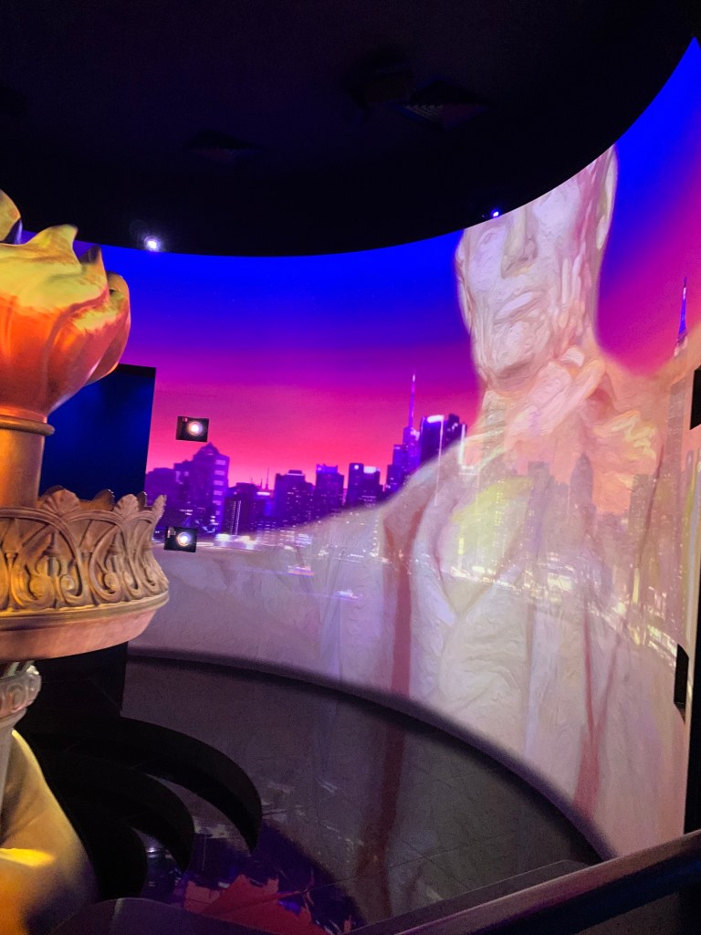 We didn’t have much time this visit, due to dinner plans, so we just visited a few pavilions. Of course, we had to go see what the USA put up. The exterior of the U.S. pavilion was pretty impressive. We met a nice volunteer at the door who said he was from Utah, but grew up in Saudi Arabia because his father worked for ARAMCO. We really do live in a global world. The “theme” of the USA exhibit seemed to be “Life, Liberty, and the Pursuit of the Future.” Not sure what happened to “Happiness…” It was, basically, a commercial for U.S. science and technology. However, the hand and torch of the Statue of Liberty (I felt like the rest of her was underground), in front of photos of Abe Lincoln and Martin Luther King apparently intended to convey a message about freedom and human rights somehow. To be fair, I was a little distracted by the people-mover thing we had to stand on; when it turned a corner it put me off balance. My friend’s 13-year-old daughter described the U.S. pavilion as a “stepped-up” version of Disney World’s Hall of Presidents.
