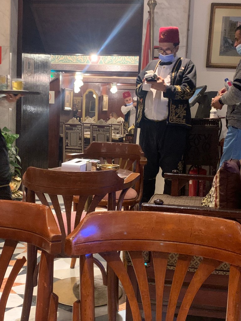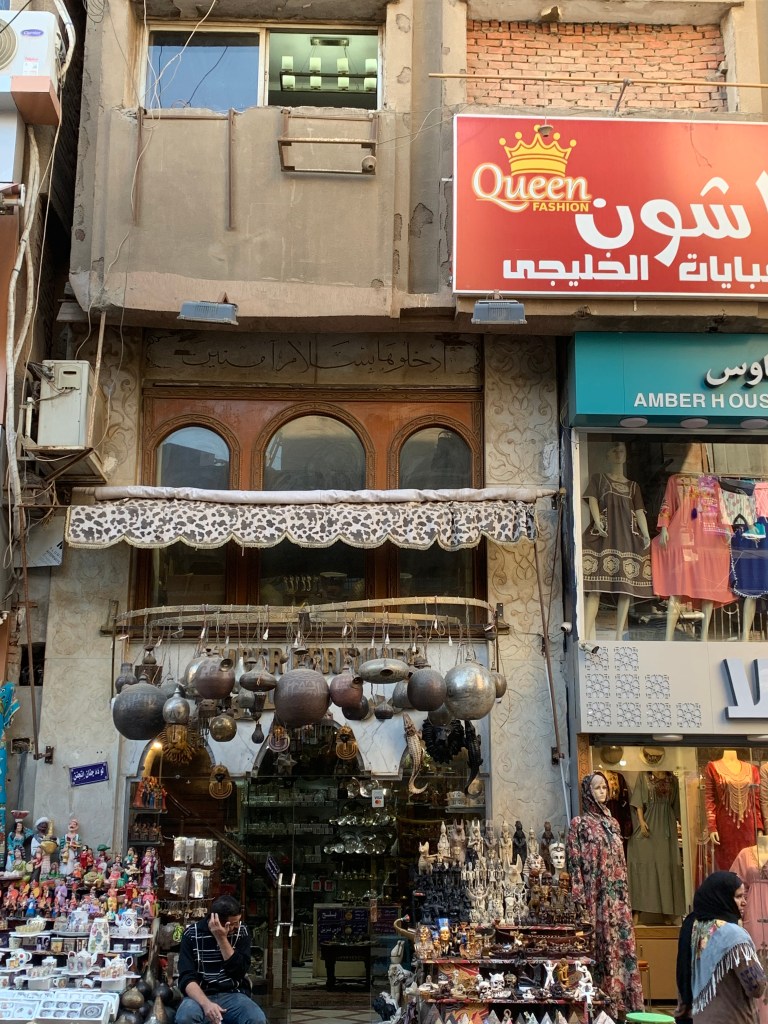 Khan al Khalili is the best souq (marketplace) I have ever been to! It is HUGE, first of all. And it is the perfect example of old meeting modern. The buildings are very old and have been there for maybe centuries. If you pay attention, you can see fabulous examples of magnificent old architecture and workmanship, particularly in things like archways, doors, doorways, and mosaics. At the same time, almost every building has a rickety window air conditioner, and has patched-up leaks or damaged spots with shiny new plastic tarps in neon colors. You can buy almost ANYTHING in Khan al Khalili. Much of the souq is, admittedly, there for tourists. Shops sell everything from T-shirts and refrigerator magnets to replicas of the pyramids or the Sphynx (in plastic, plaster, or marble, depending on your budget), to papyrus paintings, jewelry (like a gold or silver cartouche with your name in hieroglyphics), or even a life-size replica of a Pharaoh’s throne in gold lacquer. You can visit one of the earliest cafe’s where the waiters wear fez’s and brocade jackets, yet prohibit photos (that’s just unreasonable). The tourists come from everywhere: Sub-saharan Africa, Asia, the rest of the Middle East, Europe, and the U.S.