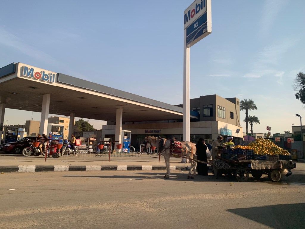 The mix of old and new in Cairo is most evident in its traffic. Cairo’s traffic is notoriously horrific. On a regular day, it can take hours to travel a distance of 5 miles. The streets that were designed for a much smaller city are clogged with a mixture of cars, trucks, buses, microbuses, taxis, motorcycles, motorized rickshaw-type vehicles AND horses, most with carts, donkeys, and camels. To make things more interesting, pedestrians (including children) frequently dash into the traffic, and stray dogs and sometimes goats or sheep, also obstruct traffic. As far as I can see, no one obeys the traffic laws (if there are any laws). The lane lines on the road, when there are any, are completely disregarded, and vehicles regularly brush side mirrors. All the while, horns are honking. It’s a human form of sonar, I guess; you beep to let someone know you are in their blind spot, to signal you are merging in to the flow of traffic, or just to hurry someone along.