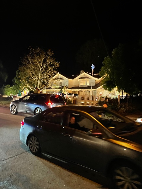 After calling the owner, who called an exterminator, and after moving all our non-refrigerated groceries into the warm refrigerator, and unpacking and getting set up, we ventured outside for a walk in the rain. Near the house, we discovered a neighborhood that had gone all out in their holiday decorating. Although there is more than one street, and they have different names, they re-name their neighborhood “Candy Cane Lane” for the holidays. Residents. selected a variety of themes, including Pokemon, The Polar Express, Narnia, and Nintendo for their decorations. We were glad to be walking because the streets were clogged with slow-moving cars full of families taking in the lights — it wouldn’t be L.A. without a traffic jam! Even though it was chilly and rainy, we still had a good time stretching our legs and taking in the festivities. We were grateful to find a food truck selling churros and hot chocolate.